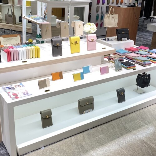 バッグや財布を見せる時 大きなものは1番下の段 カラフルでサイズの小さめのものは中段で展開 最上段は高さのあるものを展開 見せているカラーの配列のバランスも大切 また、商品と商品の間隔の取り方(幅、前後、高低)をゆったりととることも重要