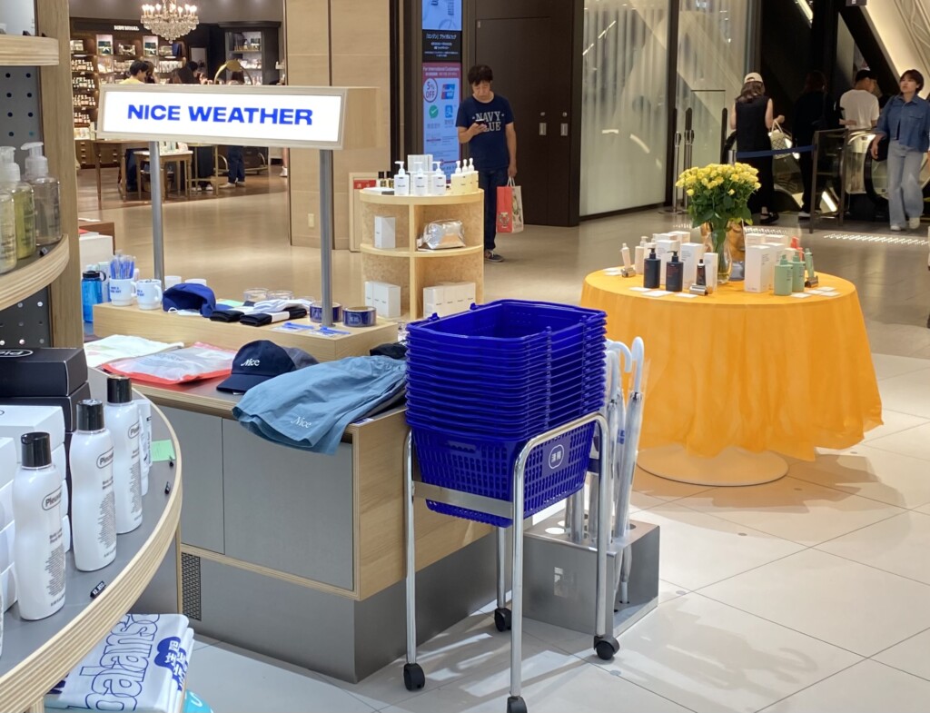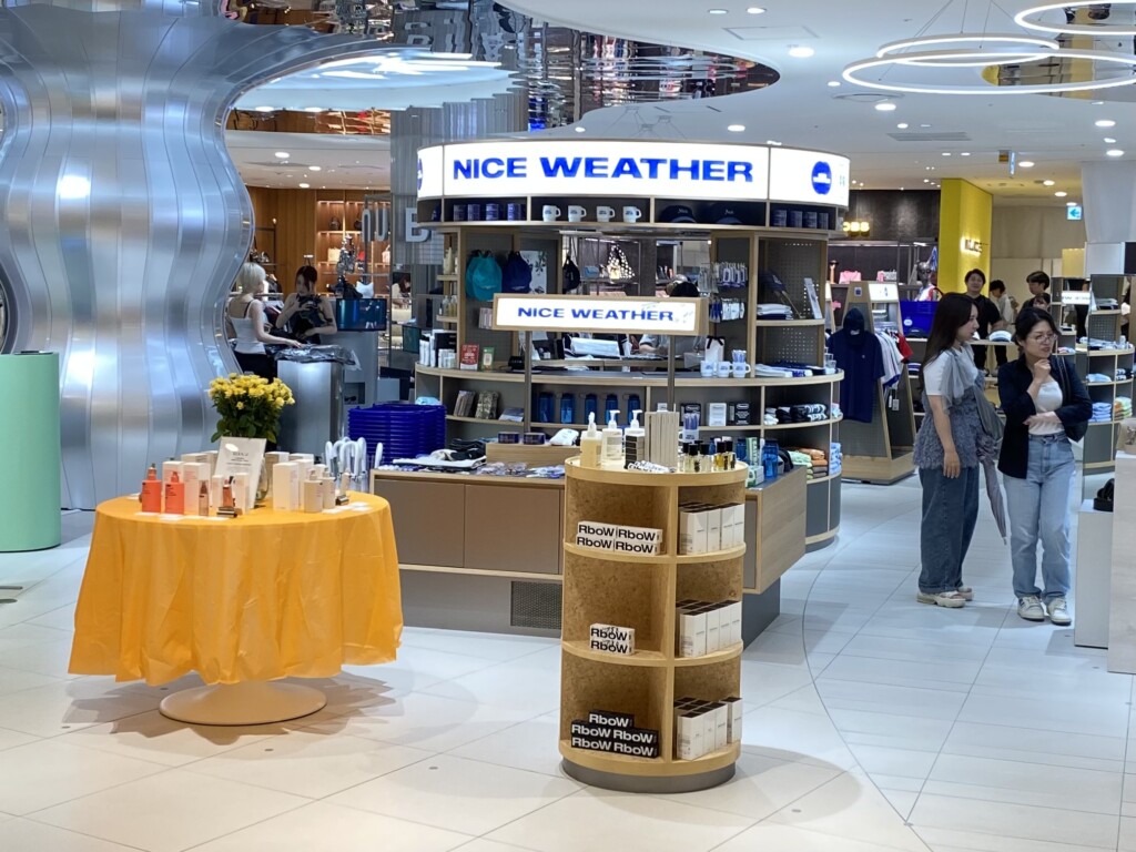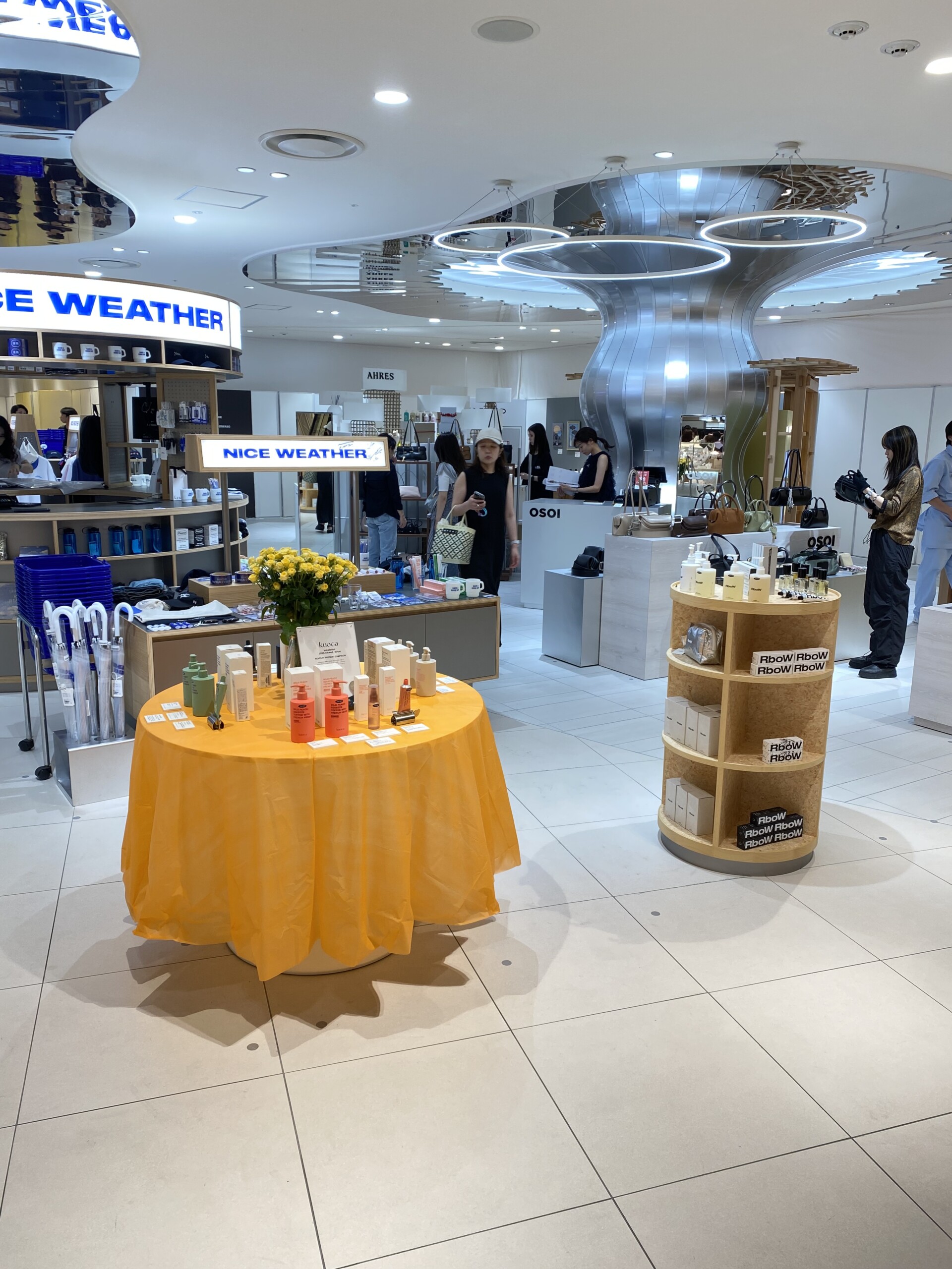 入り口付近には丸い什器にコスメや小物たちがリズムよく並んでいて、その奥にも、大きな円形の什器が配置されていました。