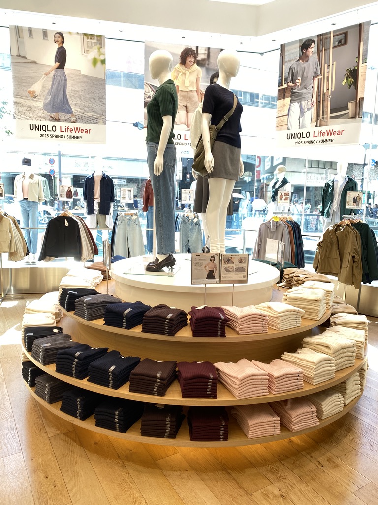 ⚫︎空間を最大限に活かした「見せる&探せる」売り場: 天井まである壁面を効果的に使い、上部では商品のコーディネート提案や魅力的なポスター(PP=ポイント・オブ・パーチェスプロモーション)で目を惹きつけ、そのすぐ下に、関連商品を豊富に陳列(IP=アイテム・プレゼンテーション)。お客様はディスプレイで「これいいな!」と思ったら、すぐにその場で商品を見つけられるので、購買意欲を逃しません。
