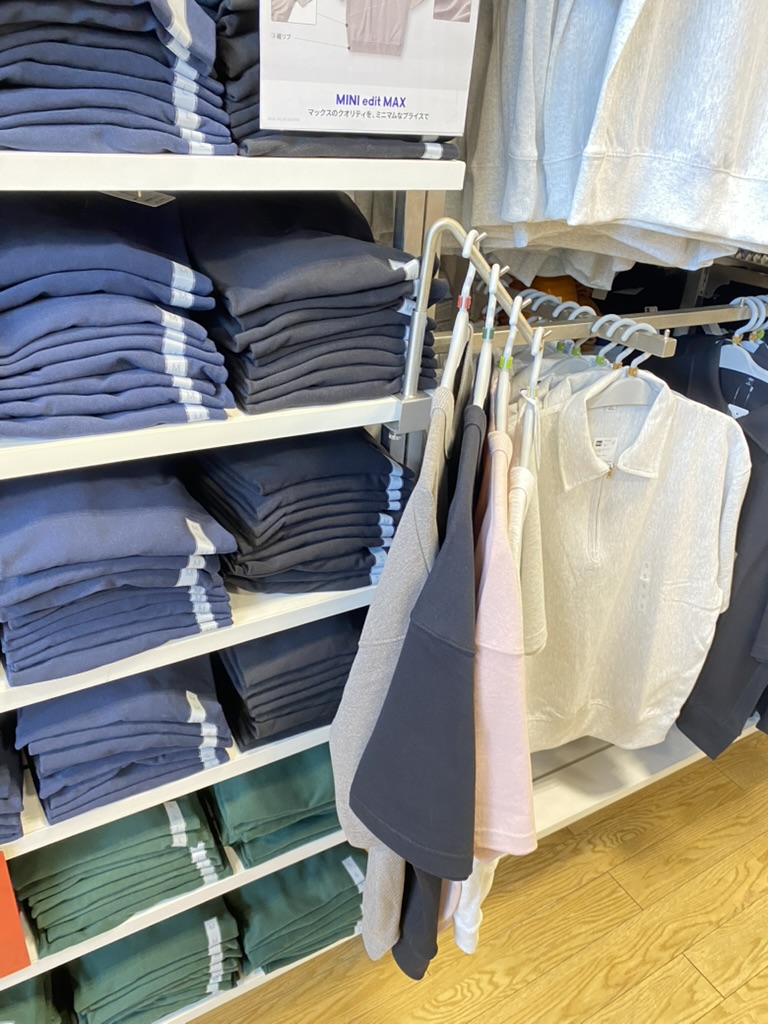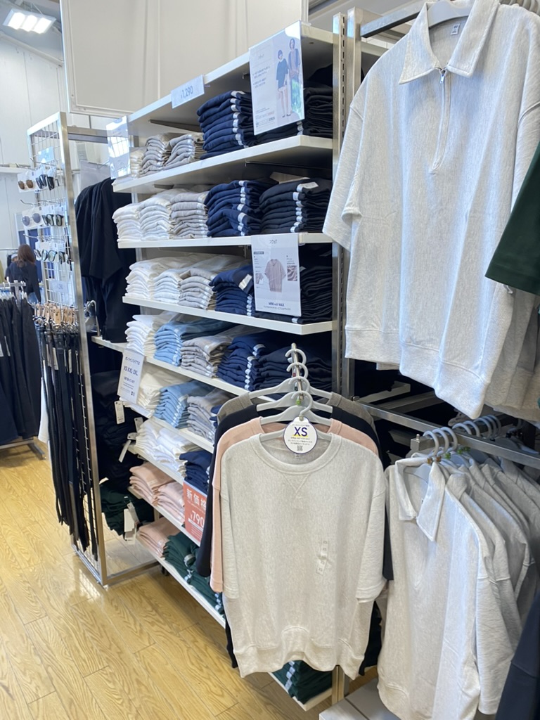 ⚫︎「触りたい」「試したい」を叶える陳列の工夫: 例えば、畳んで陳列されている棚に、数点だけ商品をハンガーにかけて吊るしているのを見たことはありませんか? これにより、畳まれた状態では分かりにくいデザインの全体像が一目で伝わり、さらに手に取りやすくもなります。お客様が商品とストレスなく触れ合えることで、「もっと詳しく見たい!」という気持ちを後押しします。