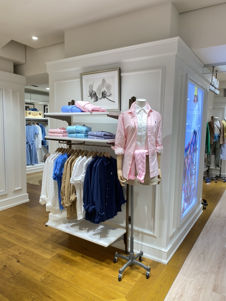 - 着こなしの提案: トルソーのディスプレイだけでなく、ハンガーにかかっているシャツも、「袖をまくる(ロールアップ)」という着こなしが提案されています。ただ並べるだけでなく、「こう着ると素敵ですよ」というメッセージが伝わります。