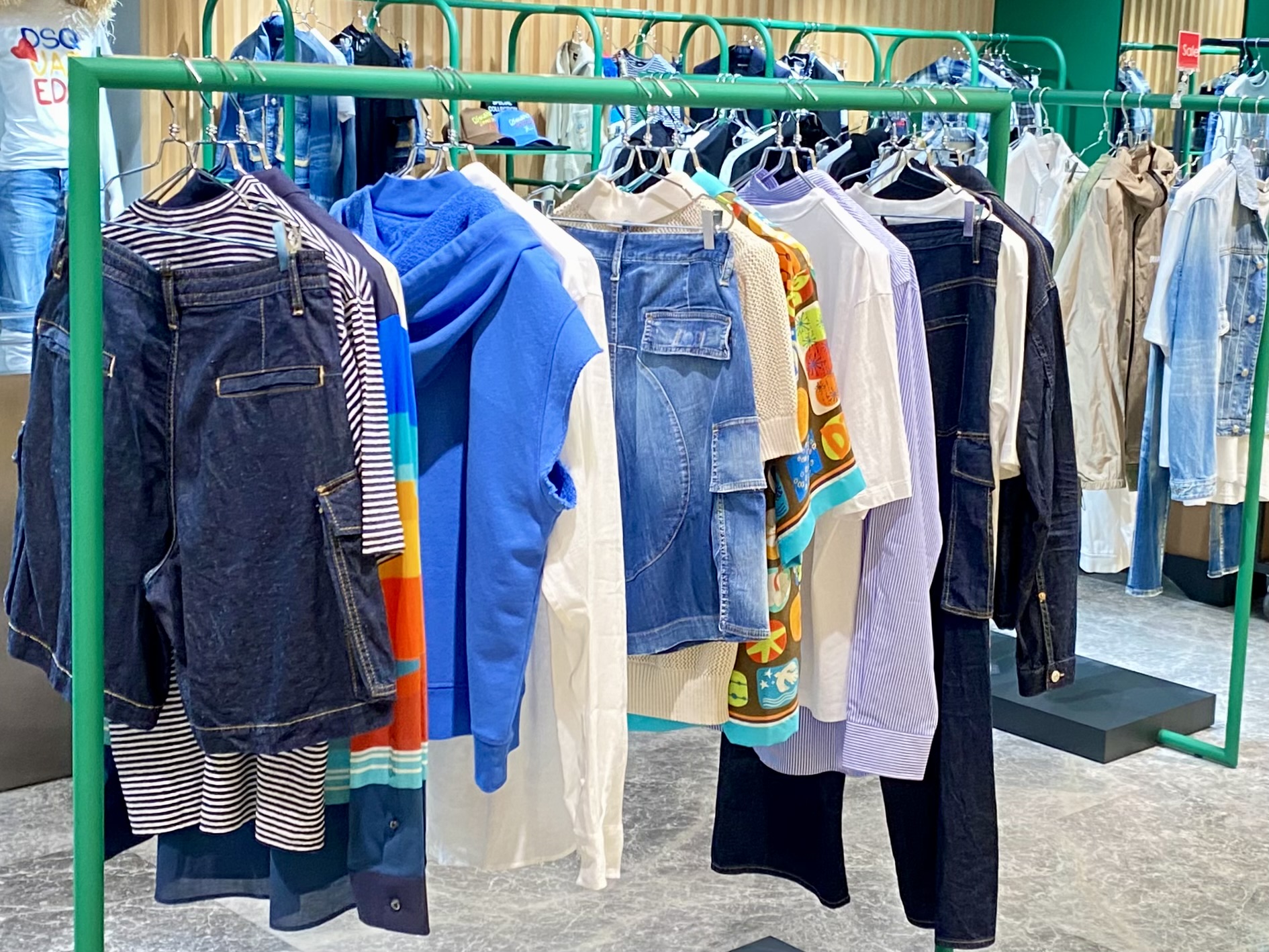 さらに、その前後にある他のセットとアイテムを入れ替えてみたりと、お客様自身が「試着を遊び」として楽しむようになります。 - お店の「こだわり」が伝わる このハンギング方法には、単に商品を並べるだけでなく、「テイストや素材に共通項を持たせる」という大切なポイントがあります。