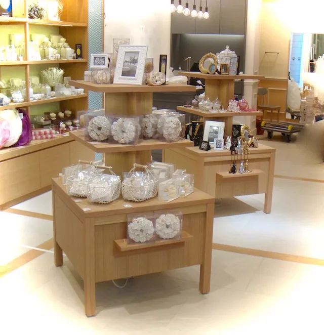 これによって、白い3段棚に置かれている商品が導線を歩くお客様の目に入りやすくなる。