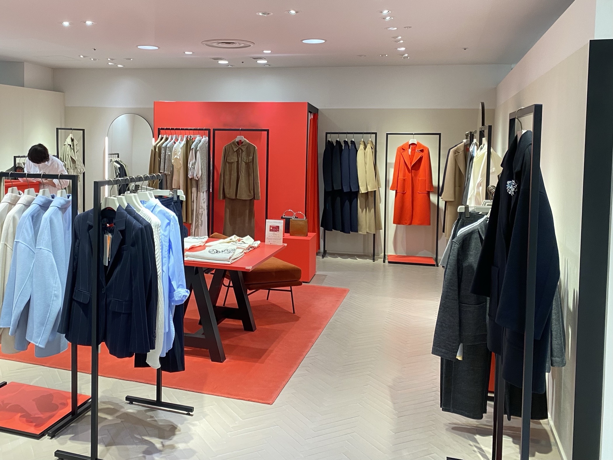 そして一番奥にある“白い壁”の前に、真っ赤なコートがディスプレイされていました。